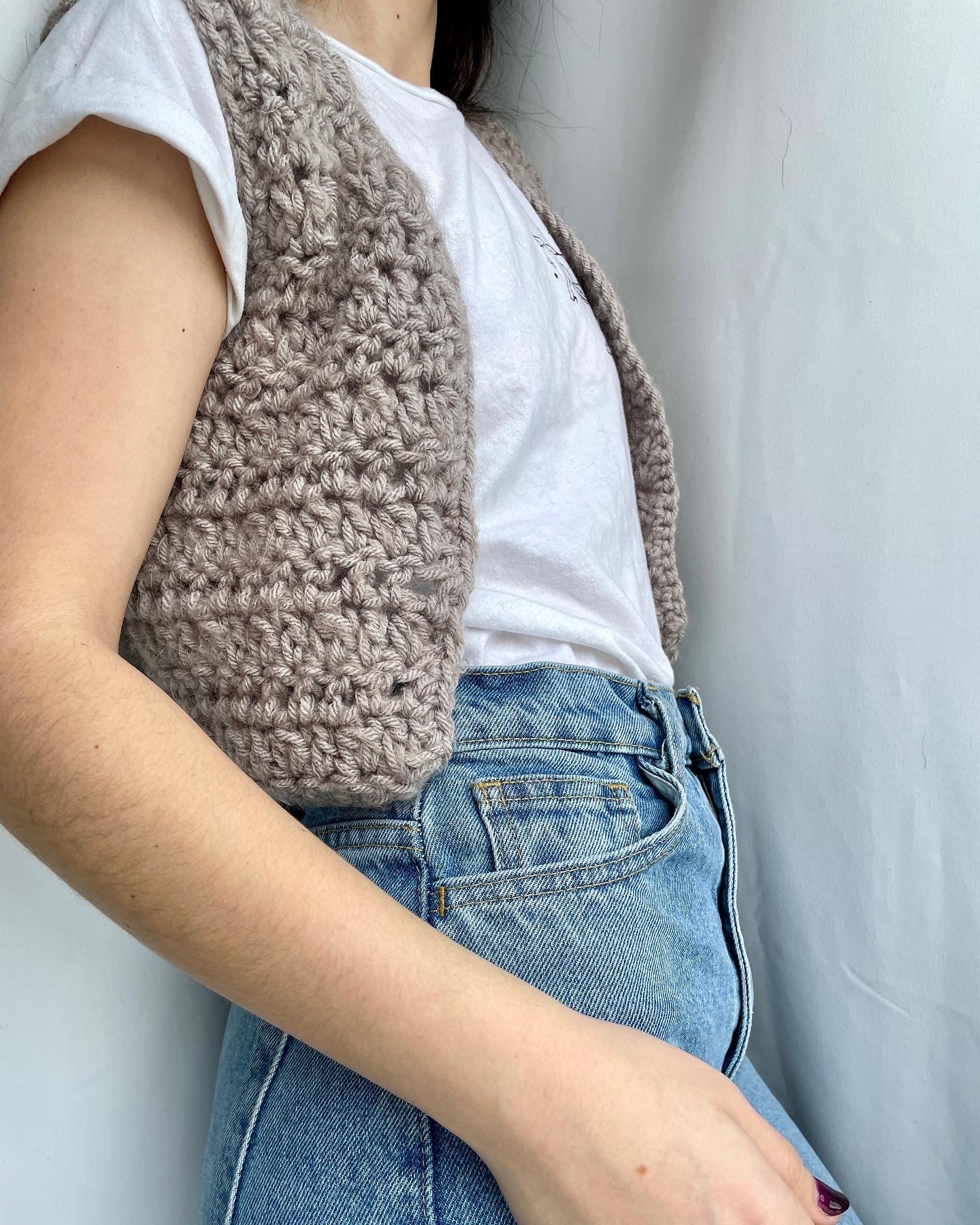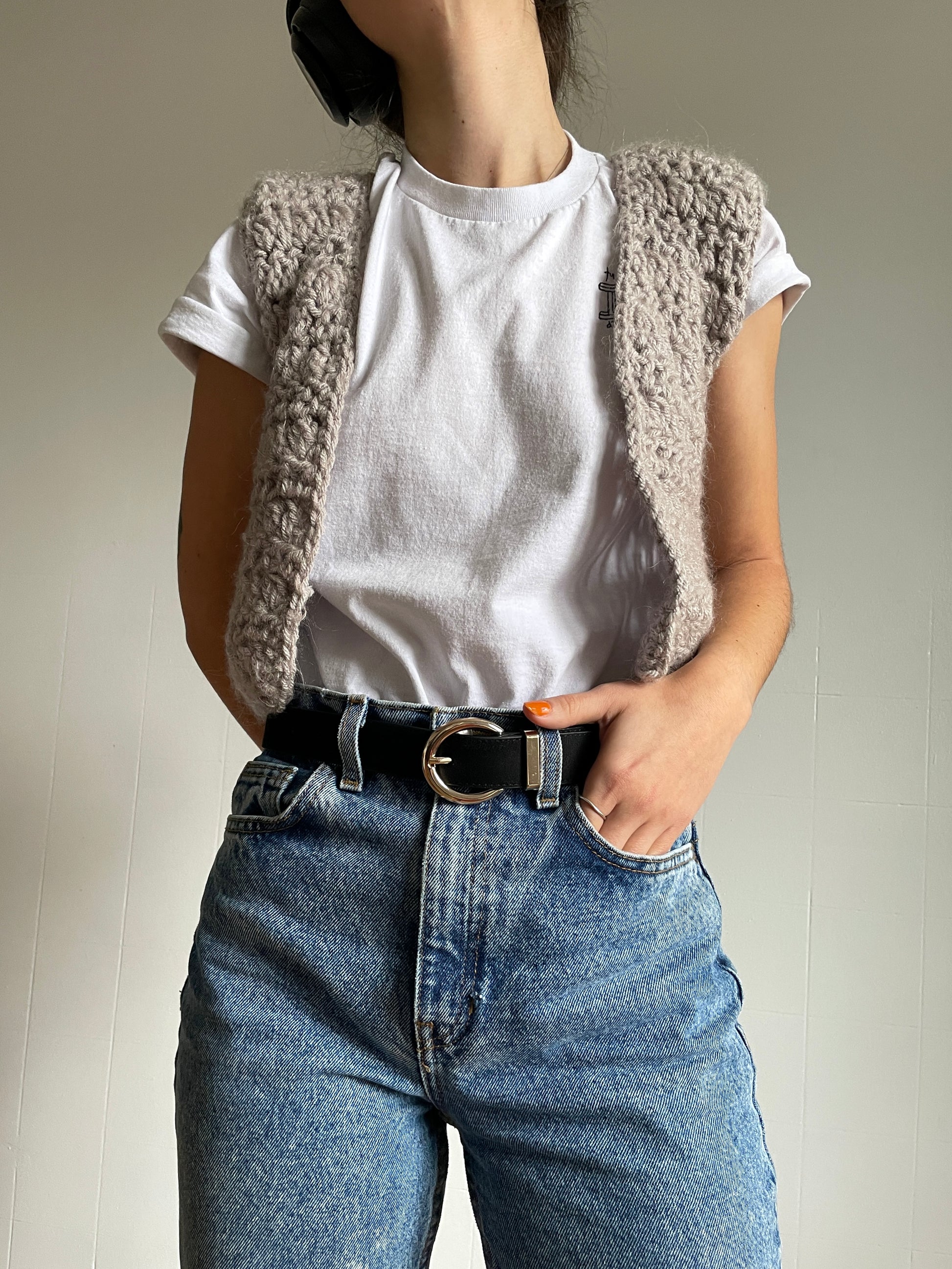 This vest is made with 100% acrylic yarn and mohair. Hand wash and lay flat to dry. Do not bleach it or dry clean it.