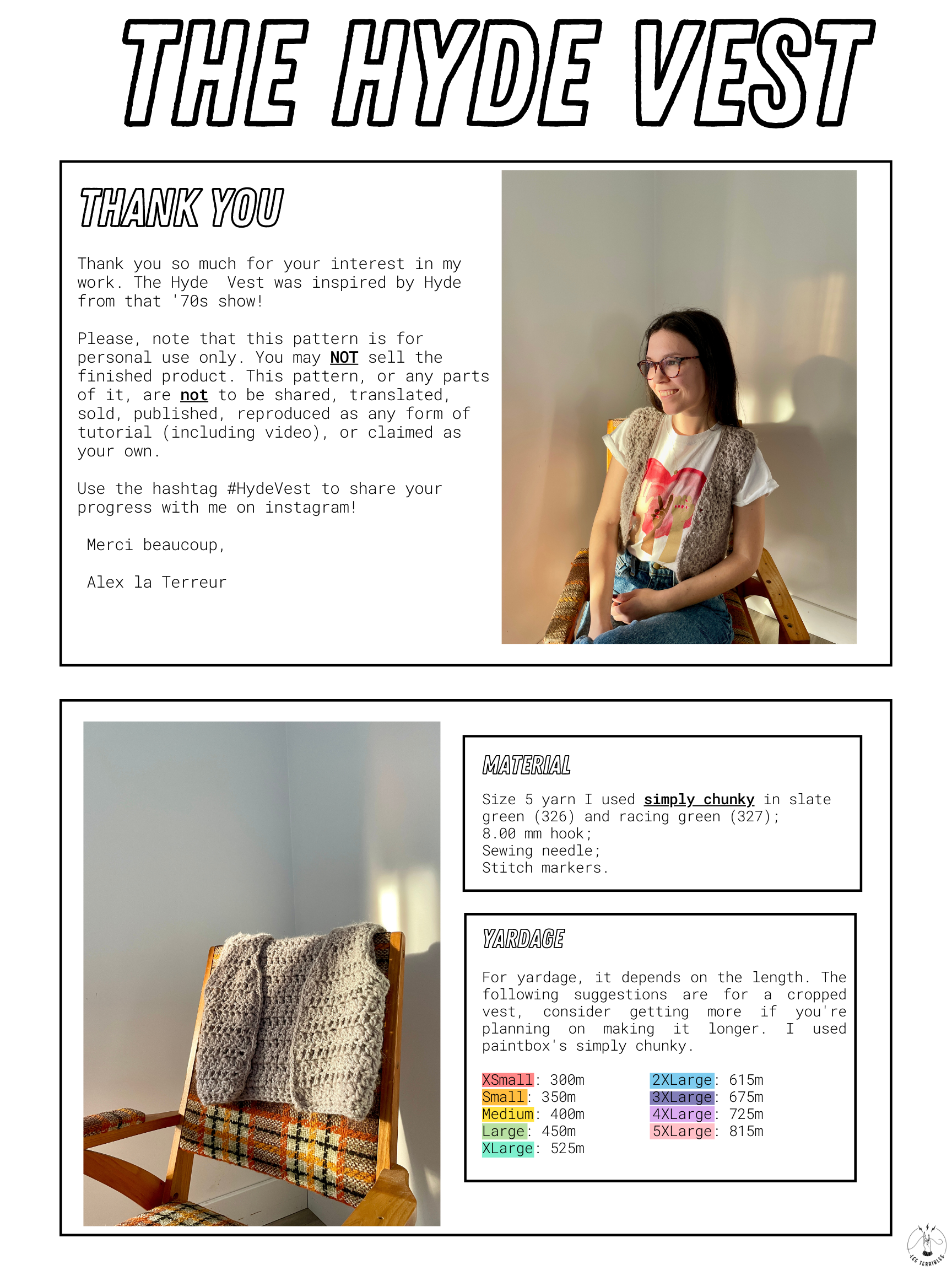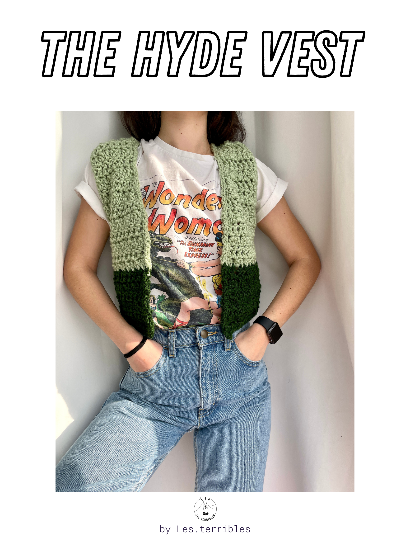 The Hyde Vest is a crochet pattern that uses US terms and is size inclusive (XS to 5XL).