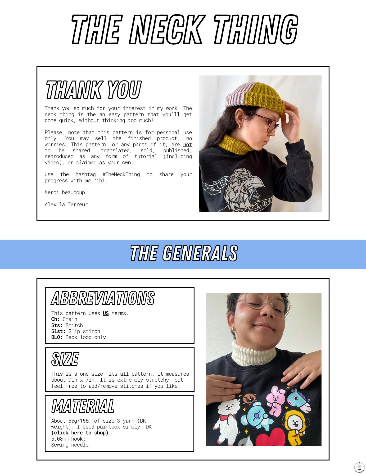 The Neck Thing is the easiest, quickest neck warmer that you'll make this year. The pattern is extremely beginner friendly, and includes lots of descriptive pictures.