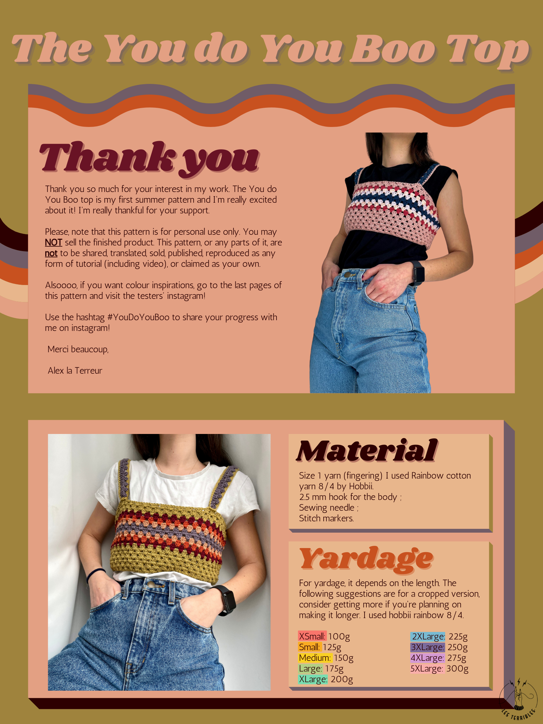 The you do you boo top is a crochet pattern that uses US terms, it is size inclusive (XS to 5XL). PLEASE, note that this is not a finished product, but a pattern!