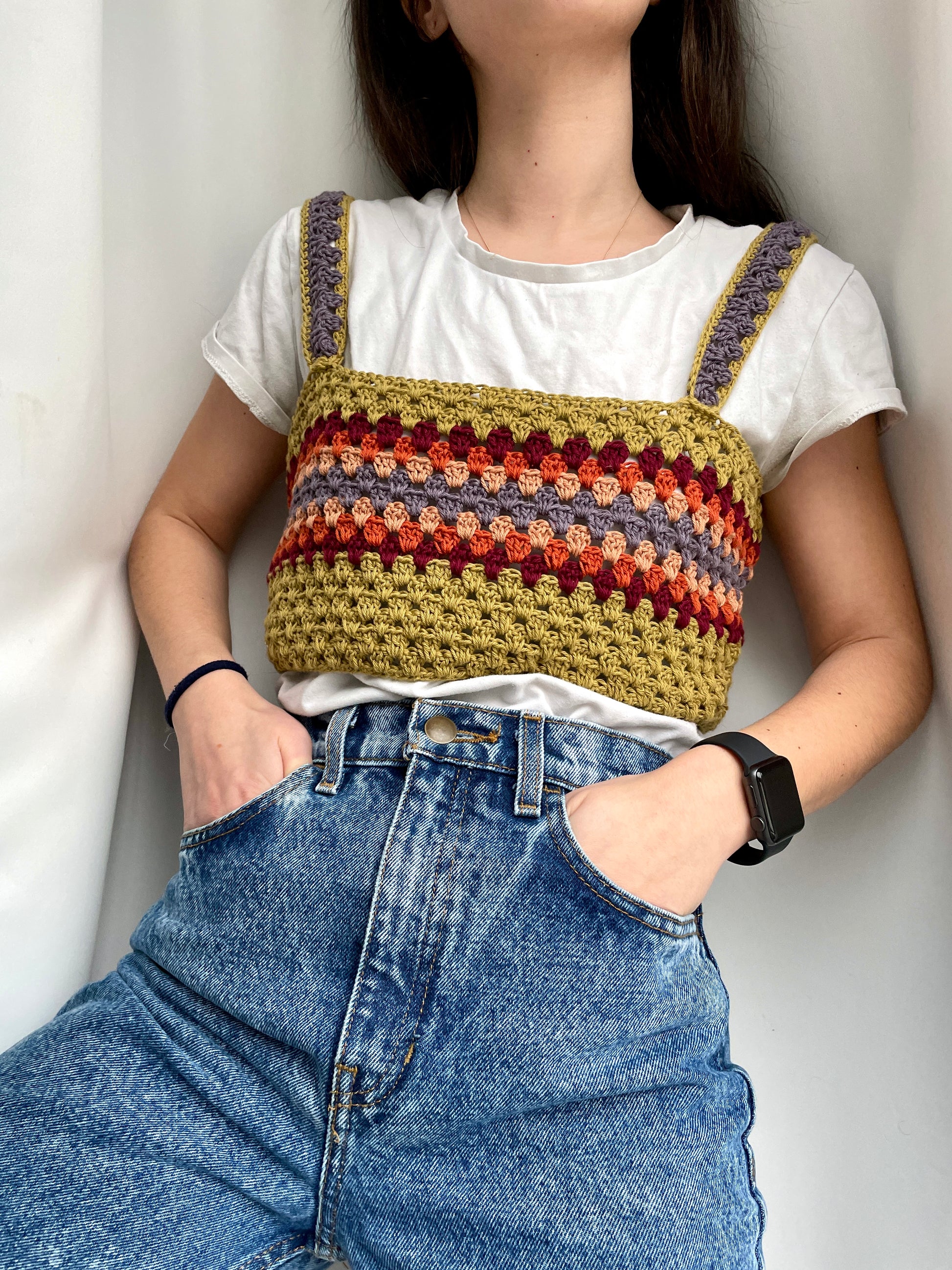 Size 1 yarn, I suggest Hobbii rainbow 8/4. For yardage, it depends on the length. The following suggestions are for a cropped version, consider getting more if you're planning on making the top or the straps longer!
